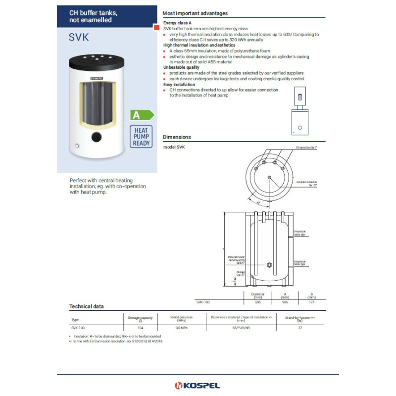 Kospel SVK buferinė talpa puikiai tinka darbui su šilumos siurbliu, o jos energinė klasė yra A. Kadangi jungtys nukreiptos į viršų, buferinę talpą galima lengvai sumontuoti po šilumos siurblio vidiniu įrenginiu arba elektriniu katilu. SVK buferinis rezervuaras gali veikti šildymo arba šildymo/vėsinimo sistemoje, sąveikaudamas su šilumos siurbliu.