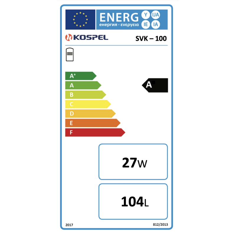 Energinė klasė A. Kospel SVK-100 talpa užtikrina aukščiausią energijos vartojimo efektyvumą. Labai gera izoliacija sumažina šilumos nuostolius iki 50 % (!) ir leidžia sutaupyti iki 320 kWh per metus, palyginus su C klasės rezervuaru.
