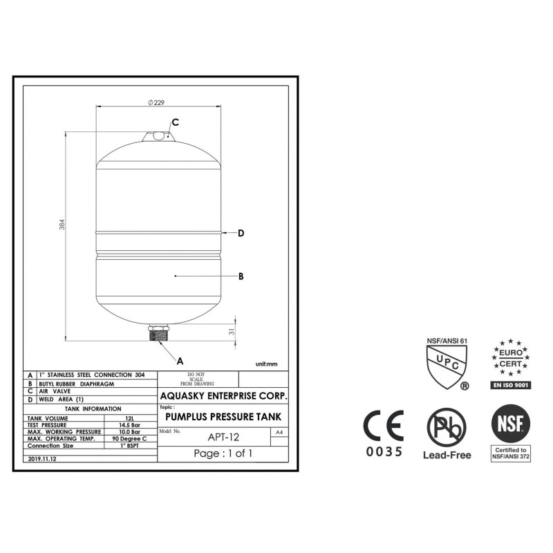 Diafragminis hidroforas Aquasky Plus APT 12. AQUASKY PLUS hidroforai yra būtina kiekvienos vandentiekio sistemos dalis. Bakas talpina slėginės sistemos vandenį ir diafragmos pagalba atskiria bako viduje esantį suspaustą orą, kuris užtikrina stabilų ir tolygu vandentiekio sistemos veikimą. Didesnė slėgio indo talpa ilgiau palaiko slėgį nustatytuose ruožuose ir atitinkamai užtikrina retesnius vandens siurblio startus. Savo ruožtu rečiau startuojantis siurblys suvartoja mažiau el. energijos, mažiau dėvisi bei tarnauja patikimiau ir ilgiau. Diafragminiai hidroforai AQUASKY PLUS nereikalauja jokio aptarnavimo, o visiems išsiplėtimo indams suteikiama 5 metų garantija.