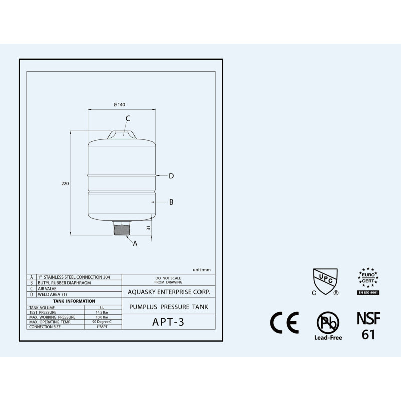 Diafragminis hidroforas Aquasky Plus APT 3. AQUASKY PLUS hidroforai yra būtina kiekvienos vandentiekio sistemos dalis. Bakas talpina slėginės sistemos vandenį ir diafragmos pagalba atskiria bako viduje esantį suspaustą orą, kuris užtikrina stabilų ir tolygu vandentiekio sistemos veikimą. Didesnė slėgio indo talpa ilgiau palaiko slėgį nustatytuose ruožuose ir atitinkamai užtikrina retesnius vandens siurblio startus. Savo ruožtu rečiau startuojantis siurblys suvartoja mažiau el. energijos, mažiau dėvisi bei tarnauja patikimiau ir ilgiau. Diafragminiai hidroforai AQUASKY PLUS nereikalauja jokio aptarnavimo, o visiems išsiplėtimo indams suteikiama 5 metų garantija.
