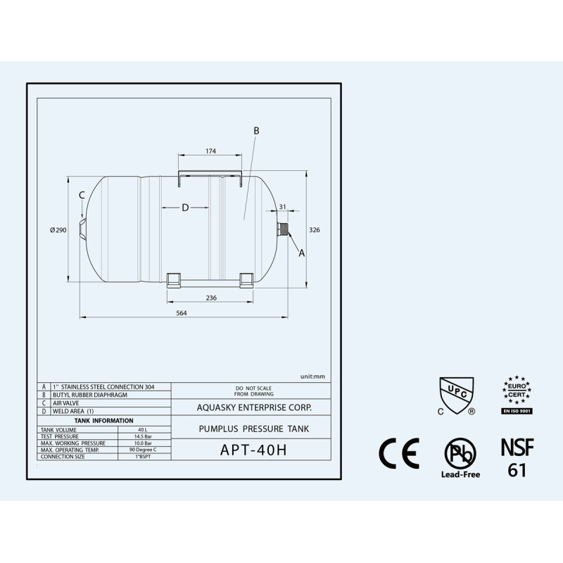 Hidroforas 40L, Horizontalus, Fiksuota diafragma, Slėgis iki 10 bar, Matmenys 326x564mm