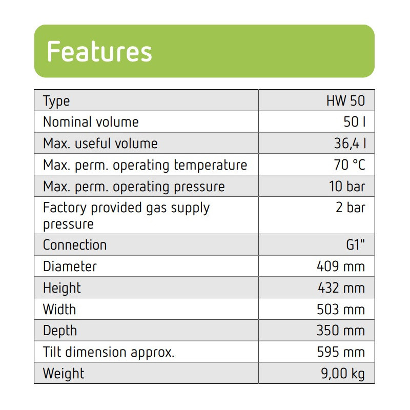 Reflex HW 50 išsiplėtimo indai yra membraninio tipo ir yra skirti centrinio šildymo uždaroms sistemoms. Išsiplėtimo indai absorbuoja padidėjusį vandens tūrį, kai pakyla šildymo sistemos temperatūra. Reflex HW 50 išsiplėtimo indai tūri patikimą sintetinės gumos membraną. Šie išsiplėtimo indai pasižymi patvarumu, o produkto dalys, kurios liečiasi su vandeniu, apsaugotos nuo korozijos. Suteikiama 2 metų garantija.