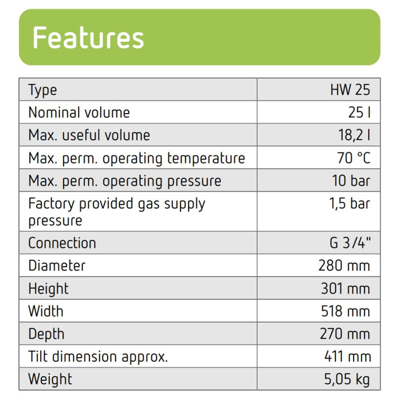 Reflex HW 25 išsiplėtimo indai yra membraninio tipo ir yra skirti centrinio šildymo uždaroms sistemoms. Išsiplėtimo indai absorbuoja padidėjusį vandens tūrį, kai pakyla šildymo sistemos temperatūra. Reflex HW 25 išsiplėtimo indai tūri patikimą sintetinės gumos membraną. Šie išsiplėtimo indai pasižymi patvarumu, o produkto dalys, kurios liečiasi su vandeniu, apsaugotos nuo korozijos. Suteikiama 2 metų garantija.
