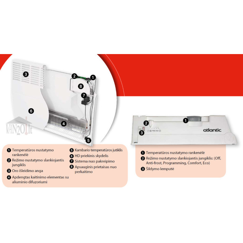 | Funkcijos | režimas Comfort;režimas Eco;režimas Antifrost;apsauga nuo užšalimo;apsauga nuo perkaitinimo |