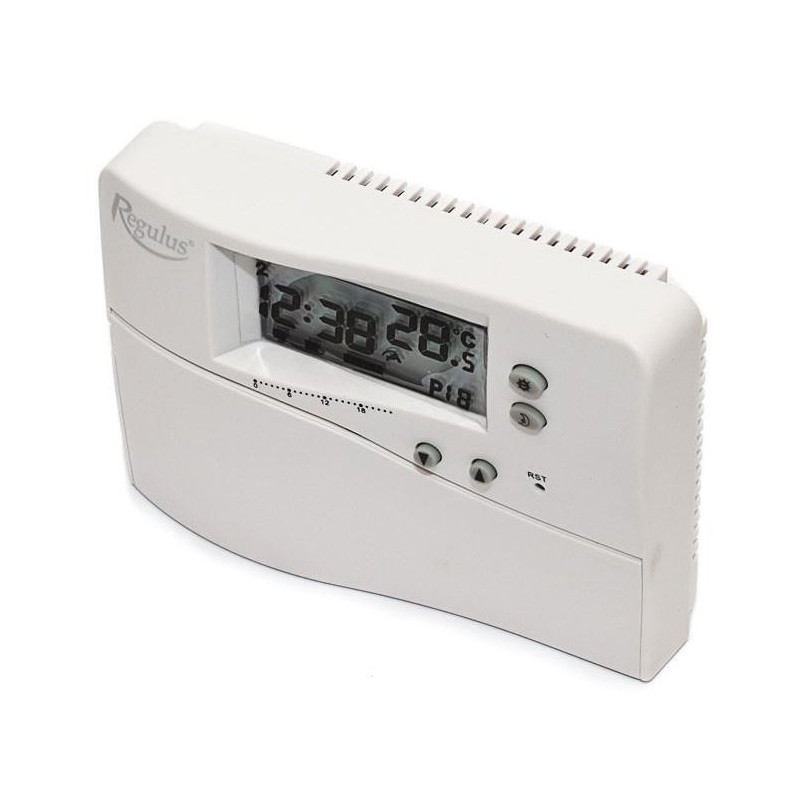 Patalpos termostatas Regulus TP08, skirtas dujiniams, elektriniams katilams. Paskirtis - palaikyti kambario temperatūrą, tokią kokia Jums yra reikalinga. Regulus TP08 gali palaikyti dvi skirtingas temperatūras: "komfortinę" ir "sumažintą". Kiekvienai savaitės dienai galima sudaryti laiko programą, kai atitinkamomis valandomis bus palaikoma Jūsų nurodyta temperatūra.