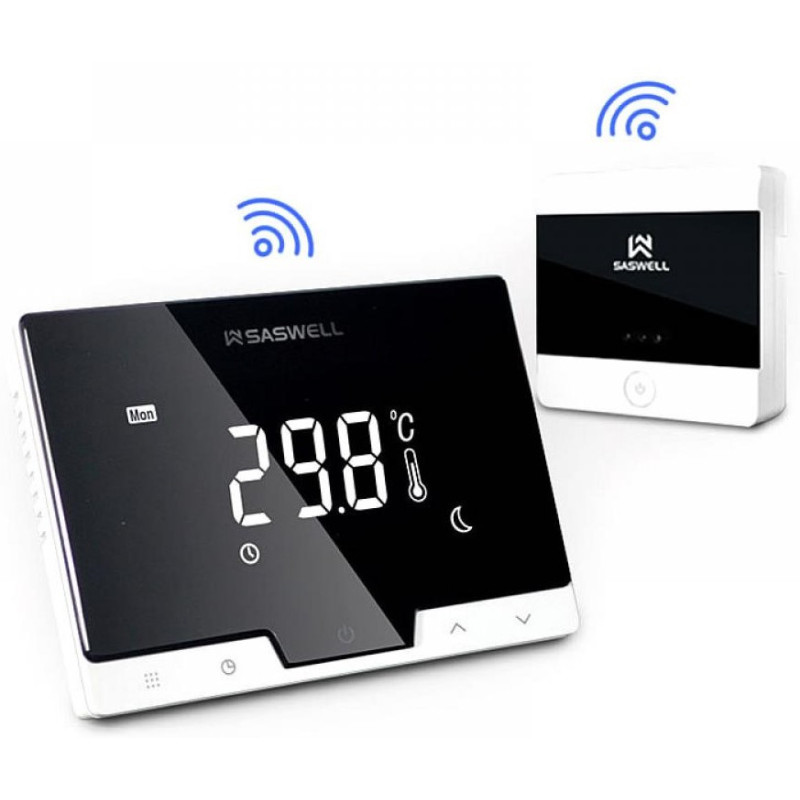 Patalpos termostatas Saswell T19WHB-7-RF-WiFi, belaidis. Termostatas turi ryškų ekraną, lengvai tvirtinamas, ir yra programuojamas– visa tai užtikrina lengvą jo montavimą ir valdymą. Šiuo įrenginiu, interneto ryšiu galima prisijungti prie namų tinklo. Į mobilųjį telefoną atsisiuntus SASWELL programėlę, galėsite telefonu valdyti katilą, keisti termostato nustatymus, bei matyti realią patalpos temperatūrą.