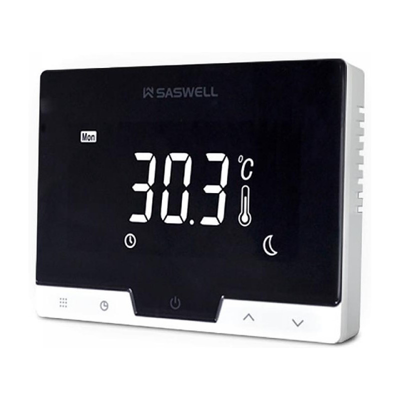 Temperatūros reguliavimo ribos 5 - 35°C, yra 6 skirtingos nustatomos paros temperatūros. Termostatas skirtas valdyti dujinius elektrinius ar kitokių kuro rūšių katilus, kuriose yra numatyta valdymo galimybė su ON/OFF tipo termostatais. Patalpos termostatas Saswell T19WHB-7-RF-WiFi, maitinamas 4xAAA baterijomis arba USB jungtimi (5V, 1000mA) arba 100-240V (60Hz).