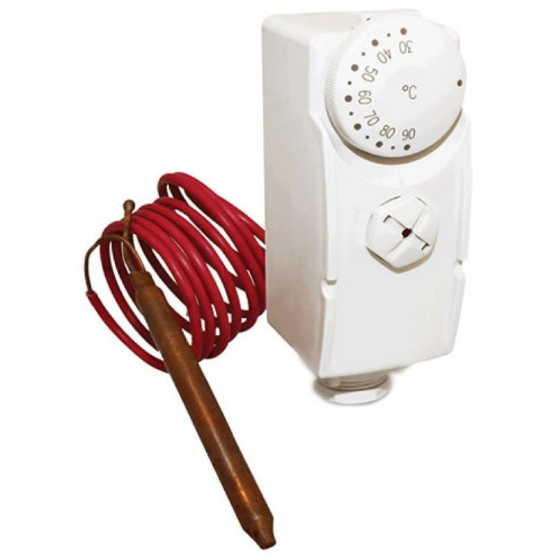 Termostatas, Su 1.2m kapiliaru, Skirtas valdyti tūrinius vandens šildytuvus, cirkuliacinius siurblius, vožtuvus, Reguliavimo diapazonas - 30-90ºC, Itin paprastas valdymas, Maitinimas - 230V (50Hz), 1 dvipolis kontaktas