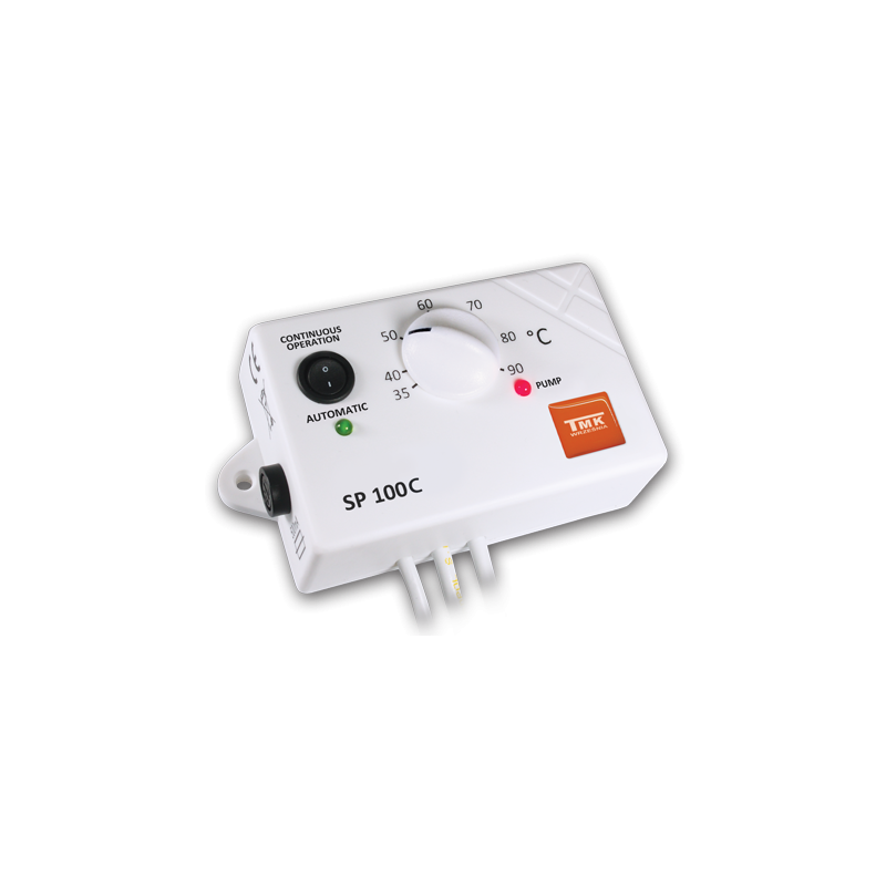 Elektroninis siurblio valdiklis TMK SP100C. Valdiklis gali būti naudojamas karšto vandens ruošimui. Palaiko iš anksto nustatytą vandens iš čiaupo temperatūrą kiekviename priėmimo taške. Temperatūros reguliavimo ribos - 35-90°C. Suteikiama 3 metų garantija (nuo pirkimo datos, bet ne ilgiau nei 4 metai nuo pagaminimo datos).