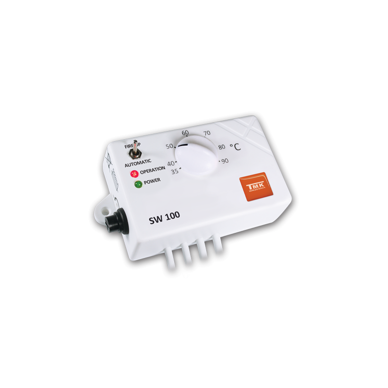Valdiklis katilo ventiliatoriui TMK SW100. Valdiklis skirtas automatiniu būdu įjungti arba išjungti katilo ventiliatorių, kuris dirba kartu su centrinio šildymo katilu. Valdiklis TMK SW100 palaiko nustatytą temperatūrą ir garantuoja katile surinktų dujų degimą. Katilo temperatūros reguliavimo ribos - 35-90°C. Suteikiama 3 metų garantija (nuo pirkimo datos, bet ne ilgiau nei 4 metai nuo pagaminimo datos).