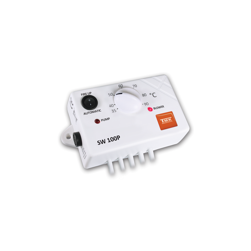Valdiklis katilo ventiliatoriui ir siurbliui TMK SW100P. Valdiklis skirtas centrinio šildymo katilų ventiliatoriui ir cirkuliaciniam siurbliui įjungti arba išjungti automatiniu būdu. Valdiklis TMK SW100P palaiko nustatytą temperatūrą ir garantuoja katile surinktų dujų degimą. Katilo temperatūros reguliavimo ribos - 35-90°C. Suteikiama 3 metų garantija (nuo pirkimo datos, bet ne ilgiau nei 4 metai nuo pagaminimo datos).