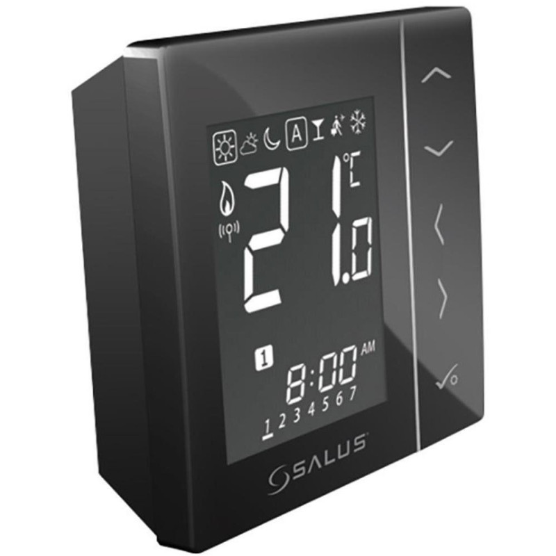 Patalpos termostatas Salus VS20BRF, programuojamas, belaidis, juodas. Termostatas turi ryškų ekraną ir yra paprastai valdomas, virštinkinio montavimo. Yra 3 temperatūrų lygiai, šildymo/vėsinimo režimai, laikmatis, integruotas Wi-Fi (2.4Ghz). Temperatūros reguliavimo ribos 5 - 35°C. Patalpos termostatas Salus VS20BRF maitinamas 4xAAA baterijomis.