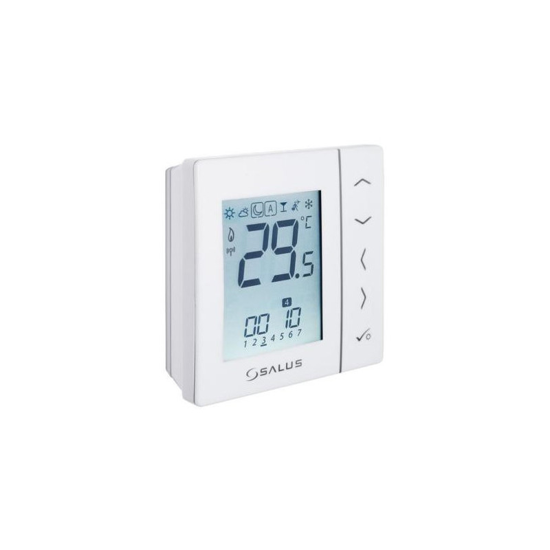 Patalpos termostatas Salus VS20WRF, programuojamas, belaidis, baltas. Termostatas turi ryškų ekraną ir yra paprastai valdomas, virštinkinio montavimo. Yra 3 temperatūrų lygiai, šildymo/vėsinimo režimai, laikmatis, integruotas Wi-Fi (2.4Ghz). Temperatūros reguliavimo ribos 5 - 35°C. Patalpos termostatas Salus VS20WRF maitinamas 4xAAA baterijomis.