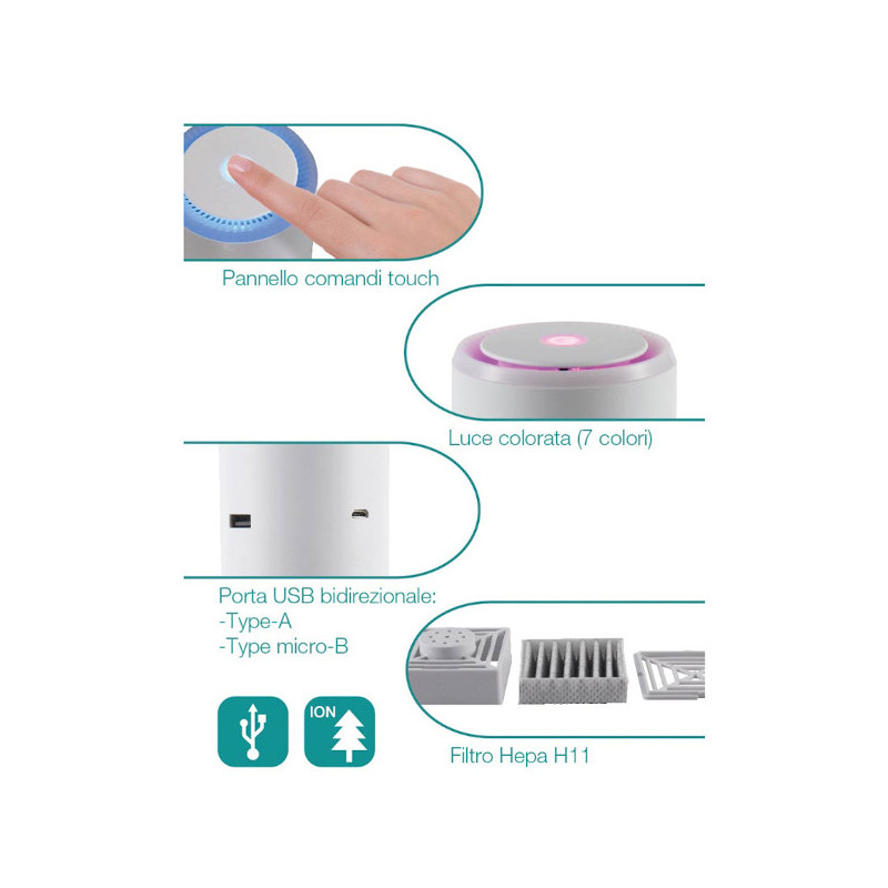 Oro valytuvas - jonizatorius Ardes HANDY. Tinkamas iki 10 m2 patalpoms. Hepa H11 filtro su aktyviąja anglimi dėka pasiekiamas aukštas oro išvalymo efektyvumas, pašalinami blogi kvapai, sulaikomos dulkių ir purvo dalelės. Galimybė valdyti filtro valymo greitį (pasirenkamas iš 2 esamų). Ardes HANDY su įdiegtu kvėpinančiu difuzoriumi. Be to, įrenginys šviečia malonia akiai šviesa - galimybė rinktis net iš 7 skirtingų spalvų. Valytuvas - jonizatorius Ardes HANDY išvalo dulkes ir sulaiko gyvūnų plaukus, todėl yra puikus pasirinkimas norint švaresnio oro nedidelėje patalpoje, kelionėje arba automobilyje. Valytuvas - jonizatorius saugus naudoti prie vaikų. Į rinkinį įeina USB laidas. Suteikiama 2 metų garantija.