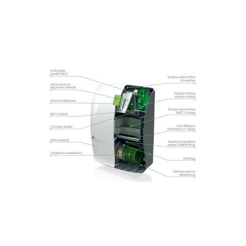 Oro valytuvas, Tinkamas patalpoms iki 75 m2, Galia 30 - 1030 W, Galimybė valdyti nuotoliniu būdu, CO2 lygio daviklis, Automatinė reguliavimo sklendė, Matmenys - 445x575x190 mm, Svoris 8 kg