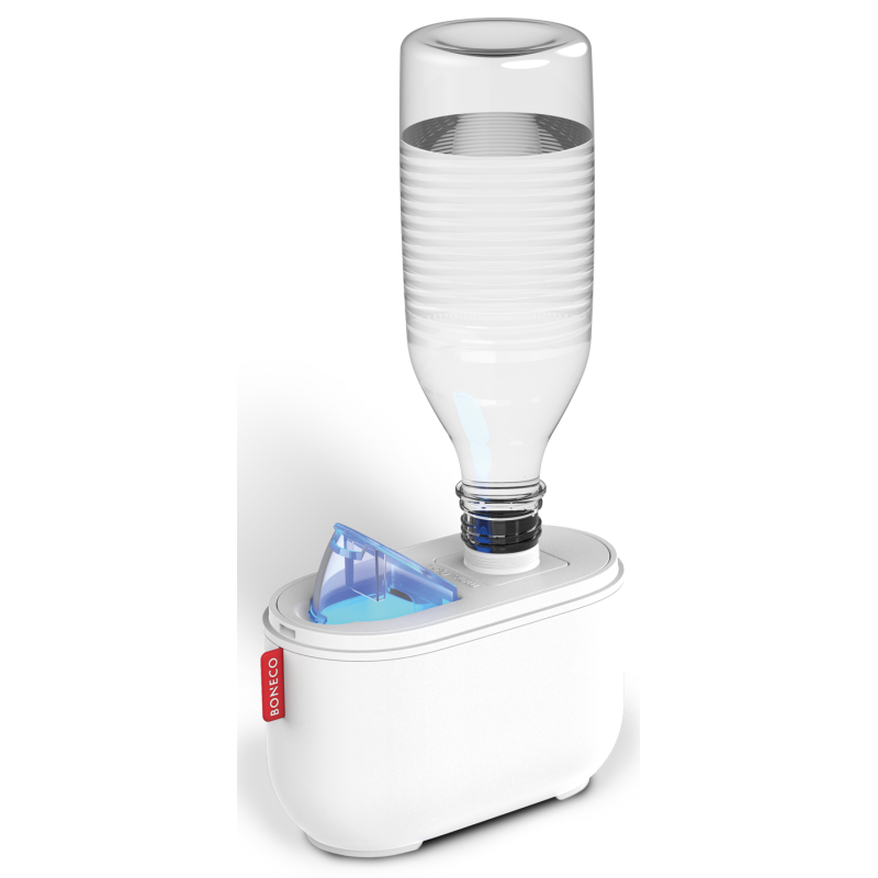 Ultragarsinis kelioninis oro drėkintuvas Boneco U100. Drėkintuvas valdomas mechaniškai. Boneco U100 drėkintuvas su 0.5l vandens rezervuaru (PET butelis) veikia labai tyliai ir naudoja mažai elektros energijos, todėl yra puikus pasirinkimas norint drėgnesnio oro keliaujant pvz: viešbučio kambaryje. Drėkintuvas Boneco U100 turi automatinio išsijungimo funkciją, kai vandens kiekis yra per mažas.