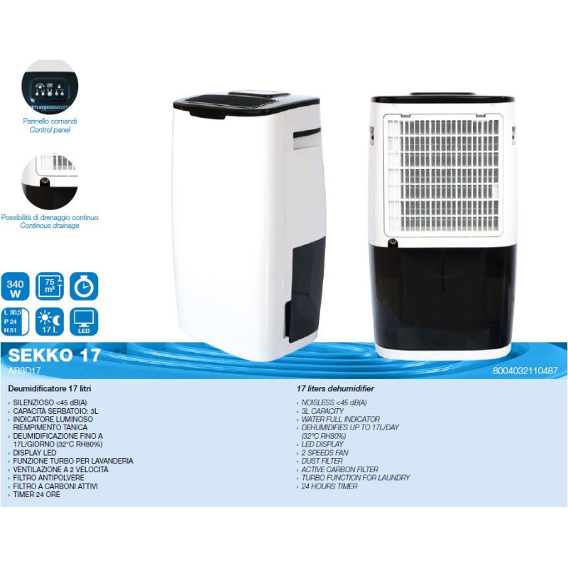 Sausintuvas patalpoms iki 30 m2 (75 m3), Našumas 17 L/24h, Bakas 3.0 L, Žemas triukšmingumas <45 dB(A), LED indikatorius, Aktyviosios anglies ir plaunamas oro filtras, Laikmatis 24h, Turbo funkcija, Galia 340 W, Matmenys (PxAxG) 305x510x240 mm