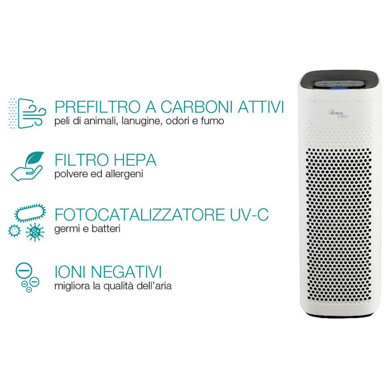Oro valytuvas - jonizatorius Ardes PYOUR. Tinkamas iki 35 m2 patalpoms. Aktyviosios anglies filtro dėka pasiekiamas aukštas oro išvalymo efektyvumas, pašalinami blogi kvapai, sulaikomos dulkių ir purvo dalelės. Imontuotas jutiklinis ekranas leidžia valdyti filtro valymo laiką (yra 8 valandų laikmatis), nustatyti automatinį greičio reguliavimą pagal oro kokybę ir naudotis kitomis oro valytuvo - jonizatoriaus funkcijomis. Yra apsauginis jutiklis, netyčia atidarius filtro skyrių. Valytuvas - jonizatorius Ardes PYOUR išvalo dulkes, kenksmingas chemines medžiagas, alergenus ir sulaiko kai kurias patogenines bakterijas, kenksmingas chemines medžiagas, todėl yra puikus pasirinkimas norint švaresnio oro namuose. Valytuvas - jonizatorius saugus naudoti prie vaikų. Suteikiama 2 metų garantija.