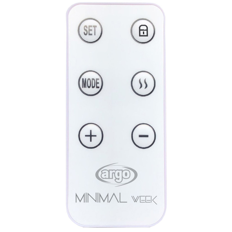 Oro šildytuvas Argo MINIMAL WEEK - baltu paviršiumi, modernaus dizaino įrenginys. Argo MINIMAL WEEK šildytuvas pasižymi greitu patalpų šildymu. Prietaisas greitai įkaista dėka aliuminio kaitinimo elemento, todėl įjungus šildytuvą po kelių sekundžių jau yra leidžiamas šiltas oras. Šildytuvas yra kompaktiškas, mobilus, lengvas, todėl prireikus galėsite nesunkiai pakeisti įrenginio vietą. Modelis su dvejais veikimo režimais: ekologišku ir komfortišku bei automatiniu išjungimo/įjungimo laikmačiu, o funkcijos valdomos pulteliu. Oro šildytuvas Argo MINIMAL WEEK pasižymi aukštu saugumo lygiu dėka jame įrengtos vaikų apsaugos sistemos ir apsaugos nuo perkaitimo. Plonas nuotolinio valdymo pultas ir LED ekranas palengvina naudojimąsi prietaisu. Yra galimybė montuoti šildytuvą ant sienos (laikikliai įeina į komplektaciją).