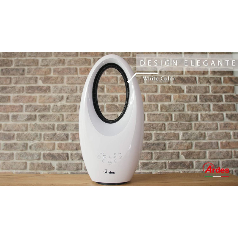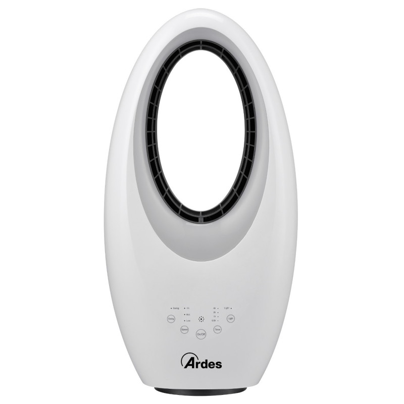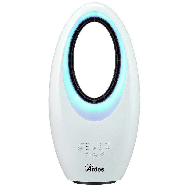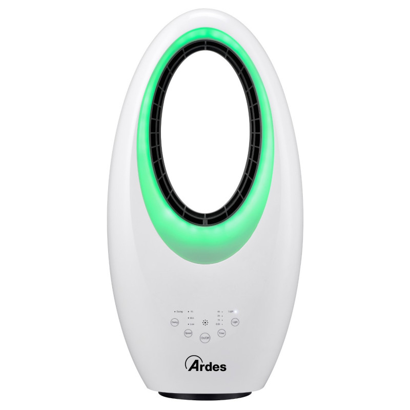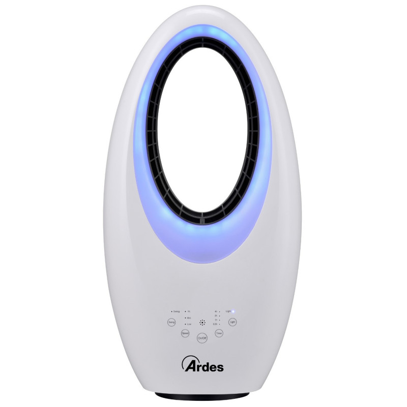 Beašmenis ventiliatorius Ardes Muna Bladeless, baltos spalvos. Ventiliatoriuje integruotas nuotolinis valdymas ir laikmatis, kurie palengvins jo naudojimą. Taip pat galima valdyti ventiliatorių ir liečiant mygtukus esančius ant jo. Ventiliatorius baltos spalvos, įmontuota naktinė LED šviesa su 4 skirtingomis spalvomis, todėl jis puikiai tiks prie įvairaus kambario interjero. Ventiliatorius Ardes Muna Bladeless, turi 3 greičio lygius ir automatinio šoninio sukiojimosi funkciją. Maksimalus oro srautas - 35.2m3/min. Suteikiama 2 metų garantija.