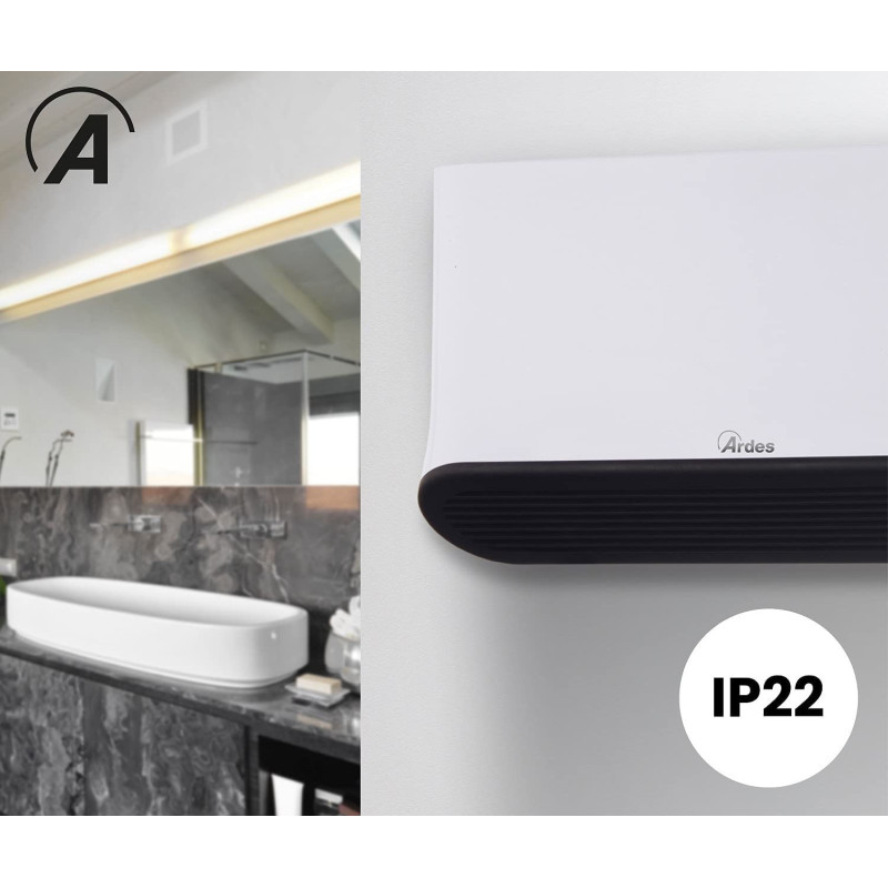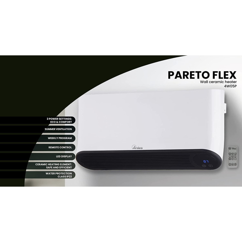 Sieninis oro šildytuvas Ardes Pareto FLEX 2000W. Oro šildytuvas Ardes Pareto FLEX - puikus pasirinkimas norintiems šildytis ekonomiškai bei jaustis komfortiškai. Vasarą toks šildytuvas veikia kaip ventiliatorius, tad nereikia pirkti papildomo ventiliatoriaus vėsinimui. Eco&Comfort galios pasirinkimai leis patiems reguliuoti šildytuvo galią. Ardes Pareto FLEX sieninis šildytuvas yra programuojamas, su laikmačiu bei valdomas su nuotoliniu pultu, todėl valdomas itin patogiai ir paprastai. Taip pat, integruotas skaitmeninis ekranas bei apsauga nuo vandens purslų ir perkaitimo. Suteikiama 2 metų garantija.
