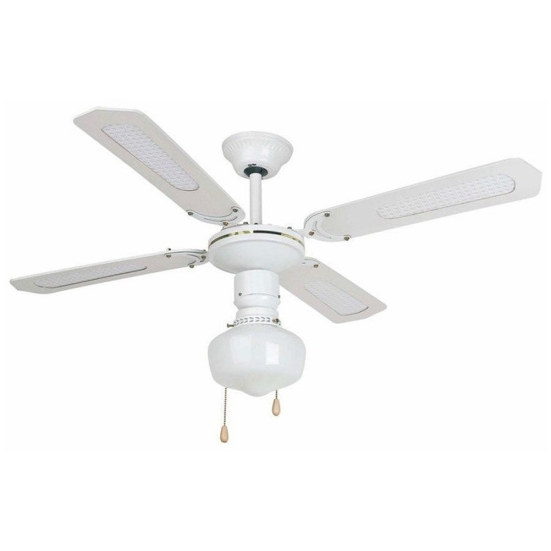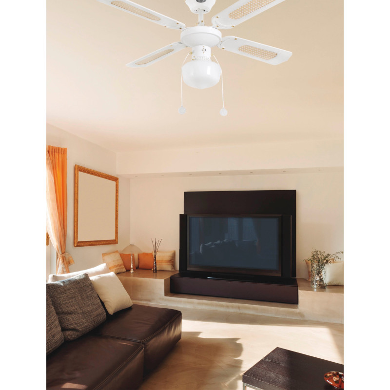Lubų ventiliatorius, Su šviestuvu, Plieninis variklis su medinėmis geležtėmis, Baltos spalvos, 106 cm skersmens, 4 ašmenys, 3 greičio lygių, Galia 30/38/50 W, Rankinis valdymas, Šviestuvui - max. 1x60W E27 lemputė