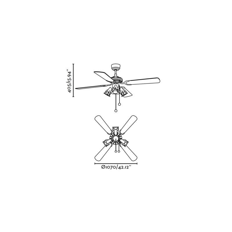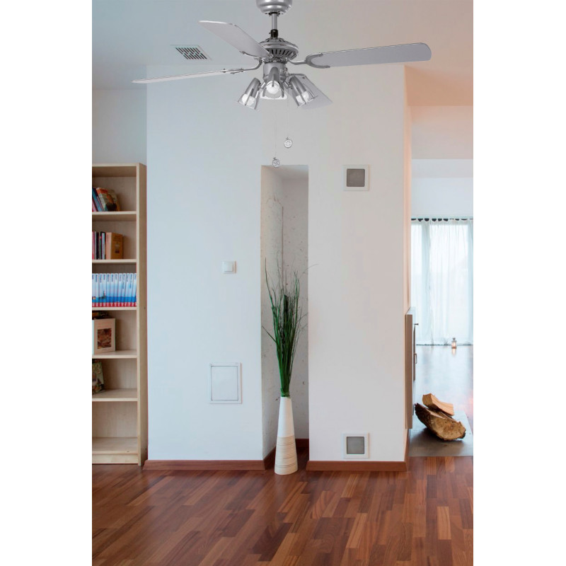 Lubų ventiliatorius, Su šviestuvu, Plieninis variklis su medinėmis geležtėmis, Pilkos spalvos, 107 cm skersmens, 4 ašmenys, 3 greičio lygių, Galia 30/40/55 W, Rankinis valdymas, Žiemos/vasaros funkcija, Lemputės - max. 3x40W E14 (perkamos atskirai)