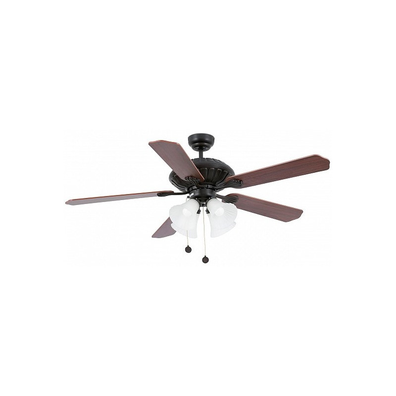 Lubų ventiliatorius, Su šviestuvu (max. 15W LED 4xE27), Plieninis variklis su medinėmis apverčiamomis geležtėmis, Rudos spalvos, 132 cm skersmens, 5 ašmenys, 3 greičio lygių, Galia 23/34/57 W, Rankinis valdymas, Žiemos/vasaros funkcija