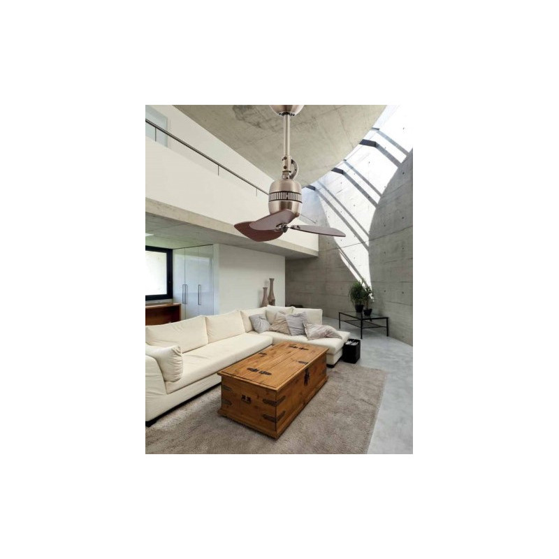 Lubų ventiliatorius, Be šviestuvo, Plieninis ir aliuminis variklis su medinėmis geležtėmis, Auksinės spalvos, 46 cm skersmens, 3 ašmenys, 4 greičio lygių, Galia 19/22/34/37 W, Sieninis valdymas