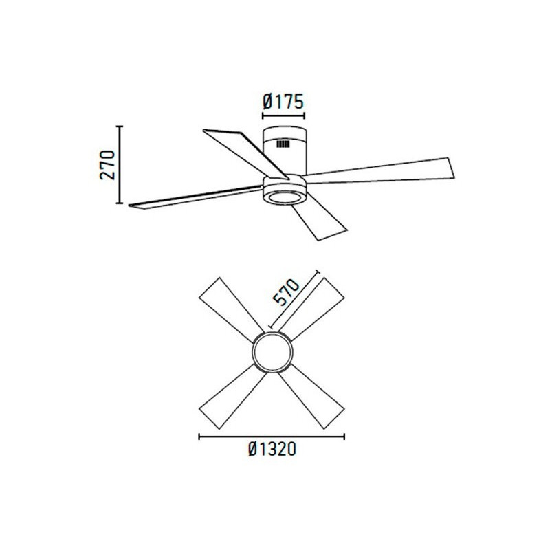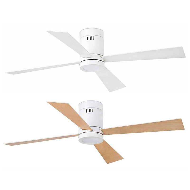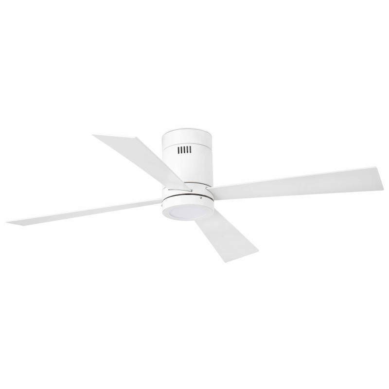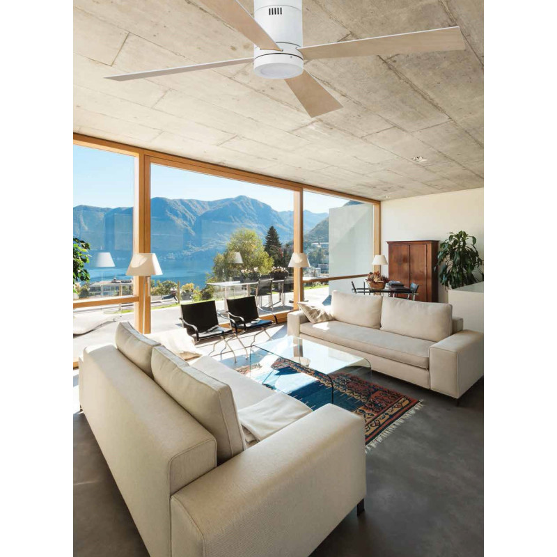 Lubų ventiliatorius, Su LED šviestuvu (komplekte), Plieninis variklis su medinėmis apverčiamomis geležtėmis, Baltos spalvos, 132 cm skersmens, 4 ašmenys, 3 greičio lygių, Galia 17/30/50 W, Nuotolinis valdymas, Žiemos/vasaros funkcija