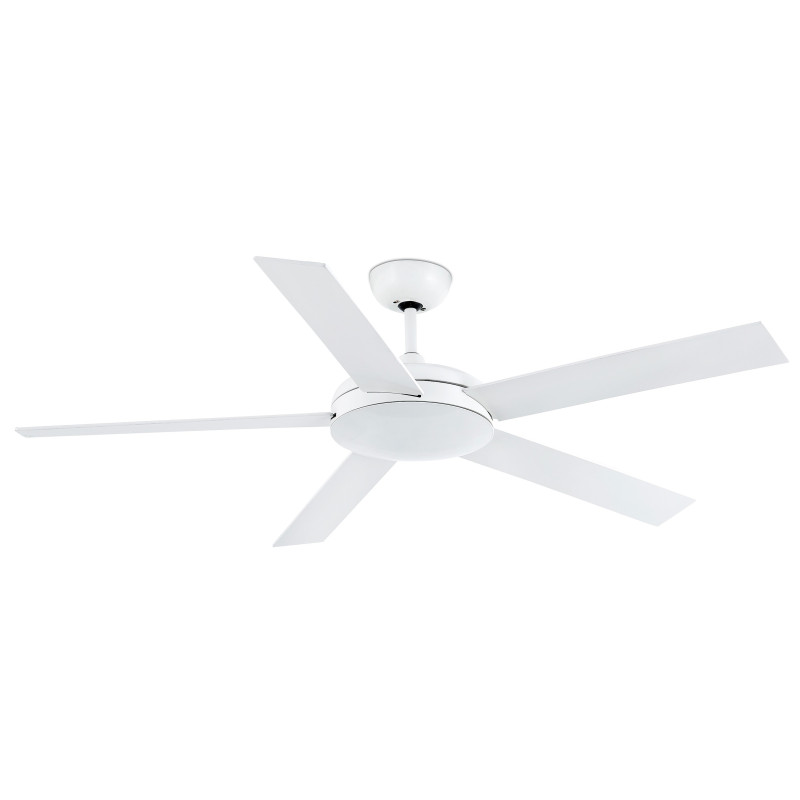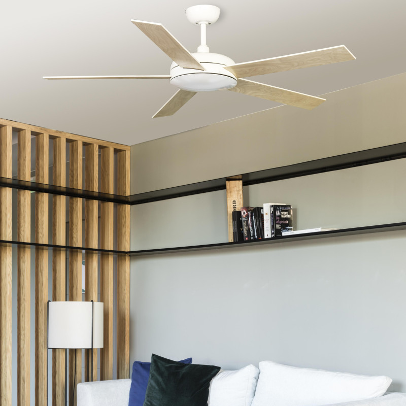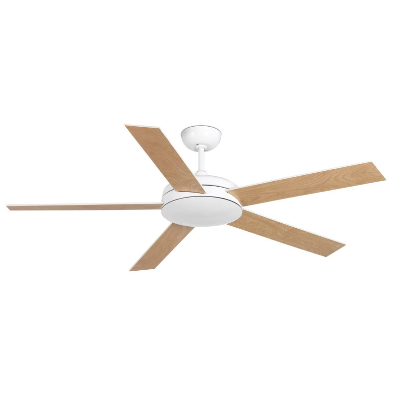 Lubų ventiliatorius, Be šviestuvo, Plieninis variklis su medinėmis apverčiamomis geležtėmis, Baltos spalvos, 132 cm skersmens, 5 ašmenys, 3 greičio lygių, Galia 17/30/62 W, Nuotolinis valdymas, Žiemos/vasaros funkcija
