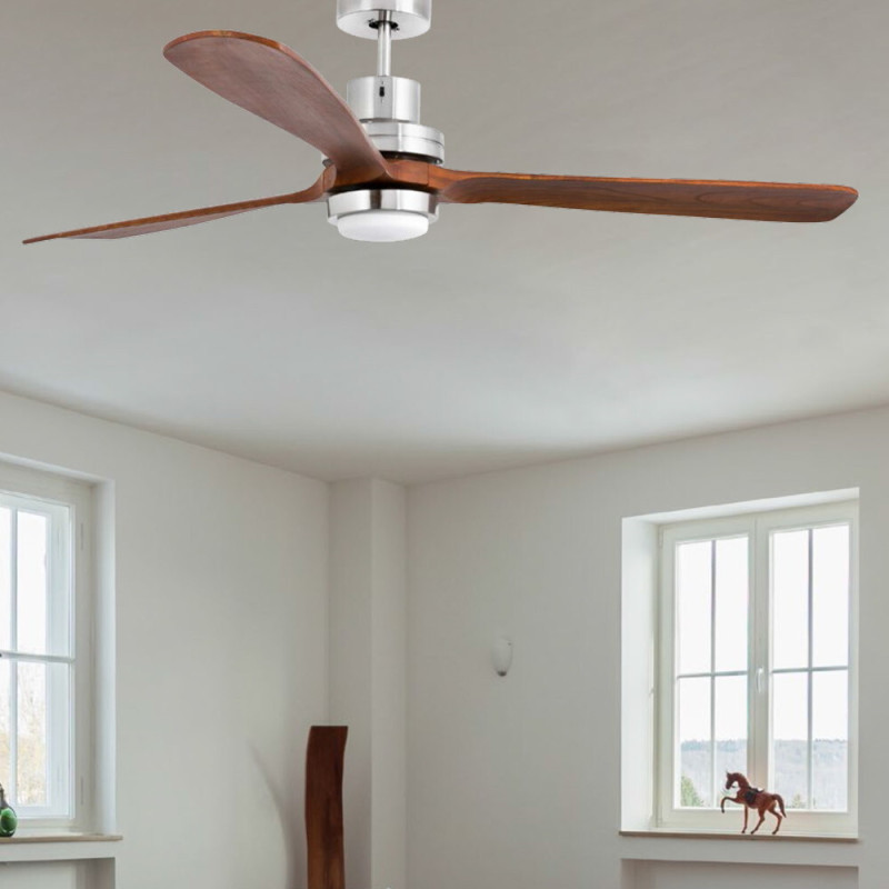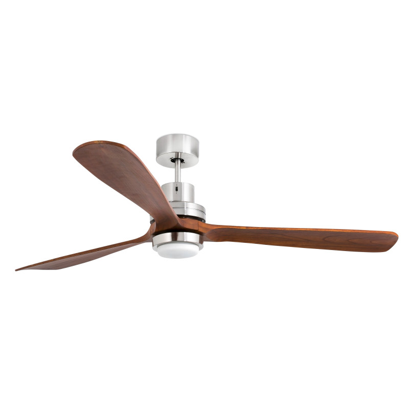 Lubų ventiliatorius, Su LED šviestuvu, Plieninis variklis su tamsiai rudomis medinėmis geležtėmis, Matinės nikelio spalvos, 168 cm skersmens, 3 ašmenys, 3 greičio lygių, Galia 25/50/90 W, Nuotolinis valdymas, Žiemos/vasaros funkcija