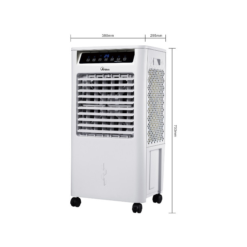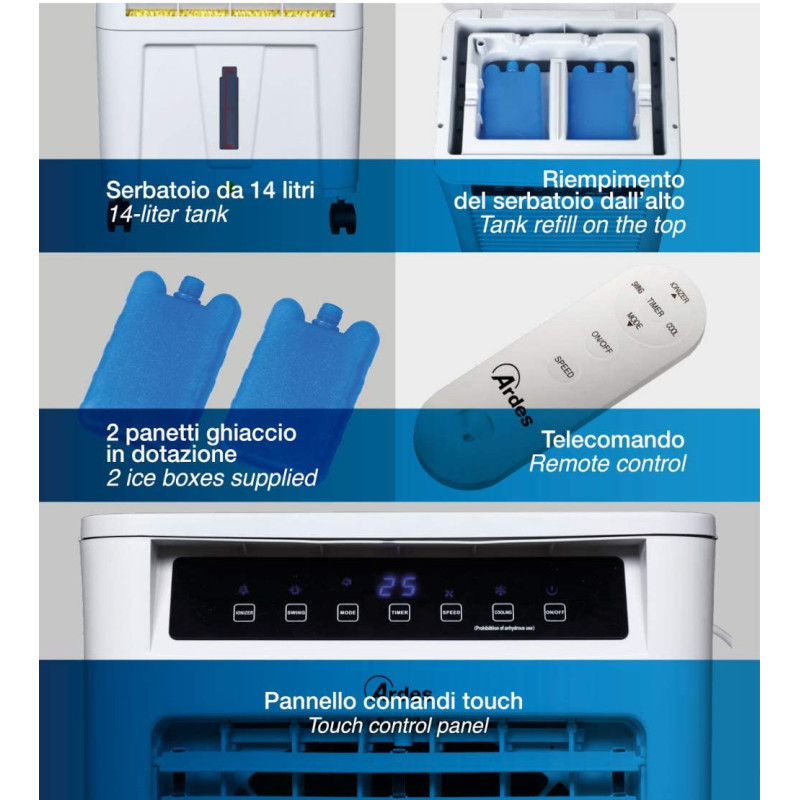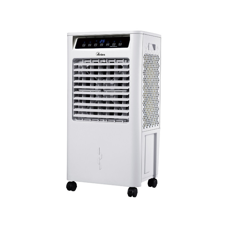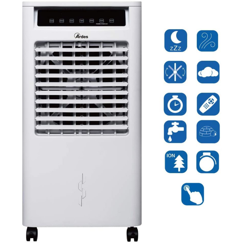 Pastatomas oro vėsintuvas/drėkintuvas Ardes Eolo Max, dėžėje, baltos spalvos. Vėsintuve integruotas nuotolinis valdymas ir laikmatis, kurie palengvins jo naudojimą. Vėsintuvo pagrindas su ratukais palengvins jo perkėlimą ten kur Jums reikia, o pats vėsintuvas puikiai tiks prie kiekvieno kambario interjero. Oro vėsintuvas/drėkintuvas turi vandens talpą, vanduo per šilumokaitį atiduoda šaltį orui, o ventiliatorius atiduoda jį į kambarį, taip pat vietoj vandens, galima naudoti ledo konteinerius. Oro vėsintuvo/drėkintuvo Ardes Eolo Max maksimalus oro srautas - 19.1m3/min. Integruotos natūralaus vėjelio ir miego režimo funkcijos. Suteikiama 2 metų garantija.