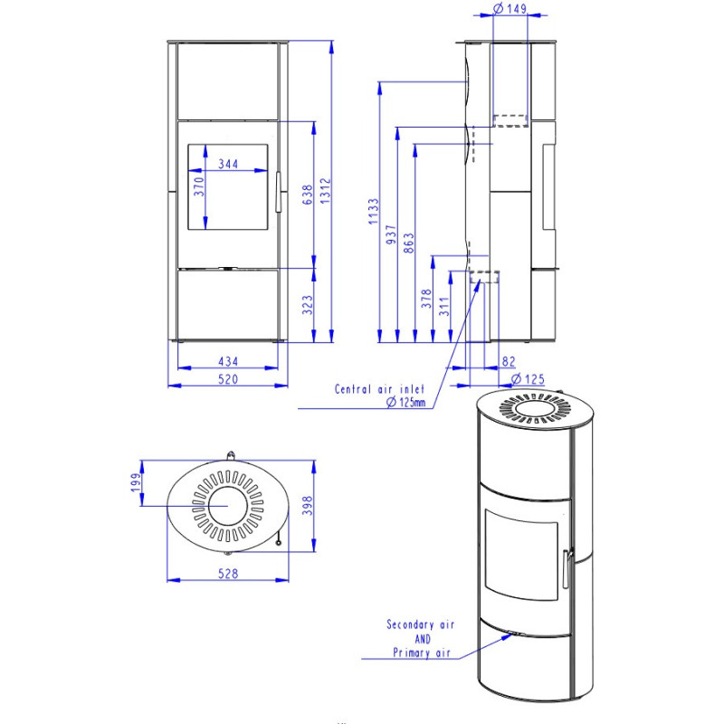 - Dūmtraukio skersmuo - 150 mm