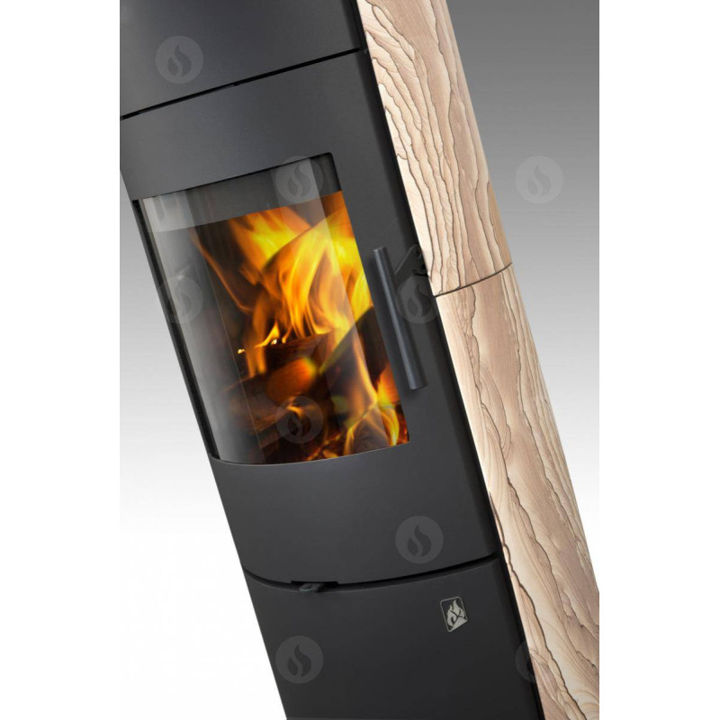 Krosnelė su smėlio akmens apdaila šonuose ir juodu korpusu. Smėlio akmuo - natūrali medžiaga, jos akumuliacinių savybių dėka patalpa apšildoma spinduline šiluma netgi ir pasibaigus kūrenimui.