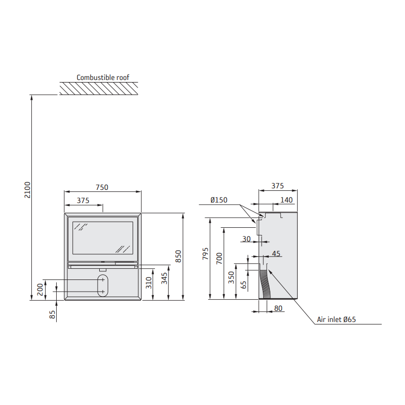 - Dūmtraukio skersmuo - 150 mm