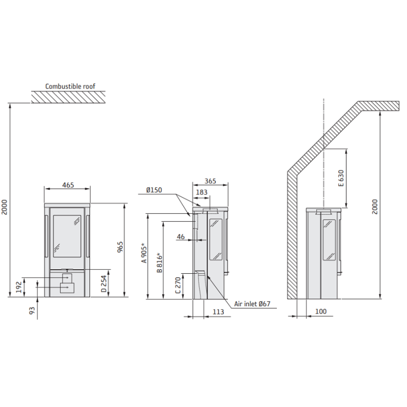 - Dūmtraukio skersmuo - 150 mm