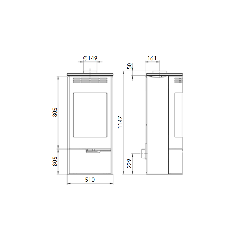 - Dūmtraukio skersmuo - 150 mm