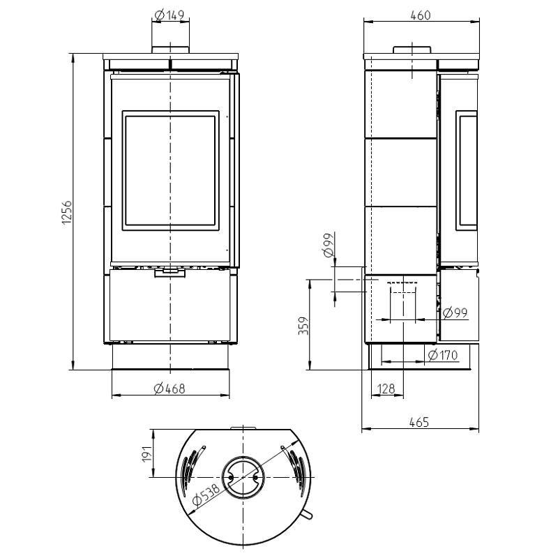 - Dūmtraukio skersmuo - 150 mm