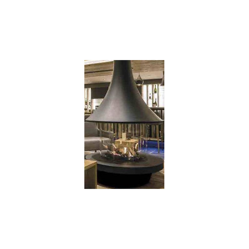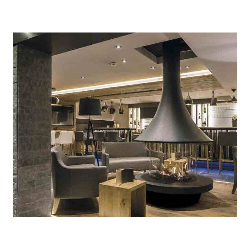 Plieninis židinys, Galia - iki 7 kW, Juodos spalvos, Montuojamas patalpos viduryje, Su pagrindu apačioje, Su keraminiu stiklu, Tvirtinamas prie lubų, Matmenys(PxAxG) 1170x2500x1170 mm, 5 metų garantija korpusui