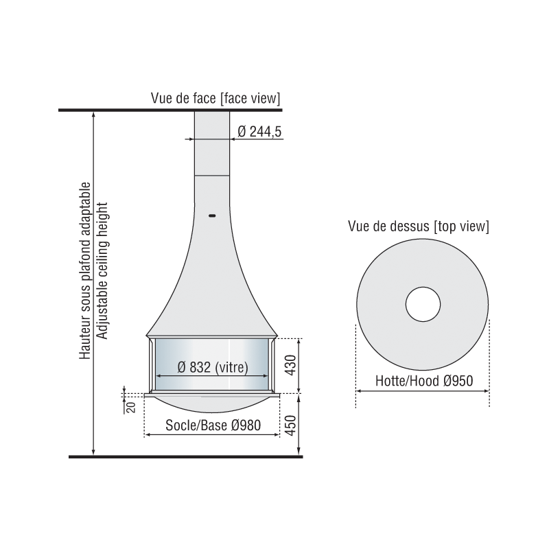 Plieninis židinys, Galia - 11 kW, Montuojamas patalpos viduryje, Tvirtinamas prie lubų, Su stiklu per visą perimetrą, Matmenys(PxAxG) 950x2438x950 mm, 5 metų garantija korpusui
