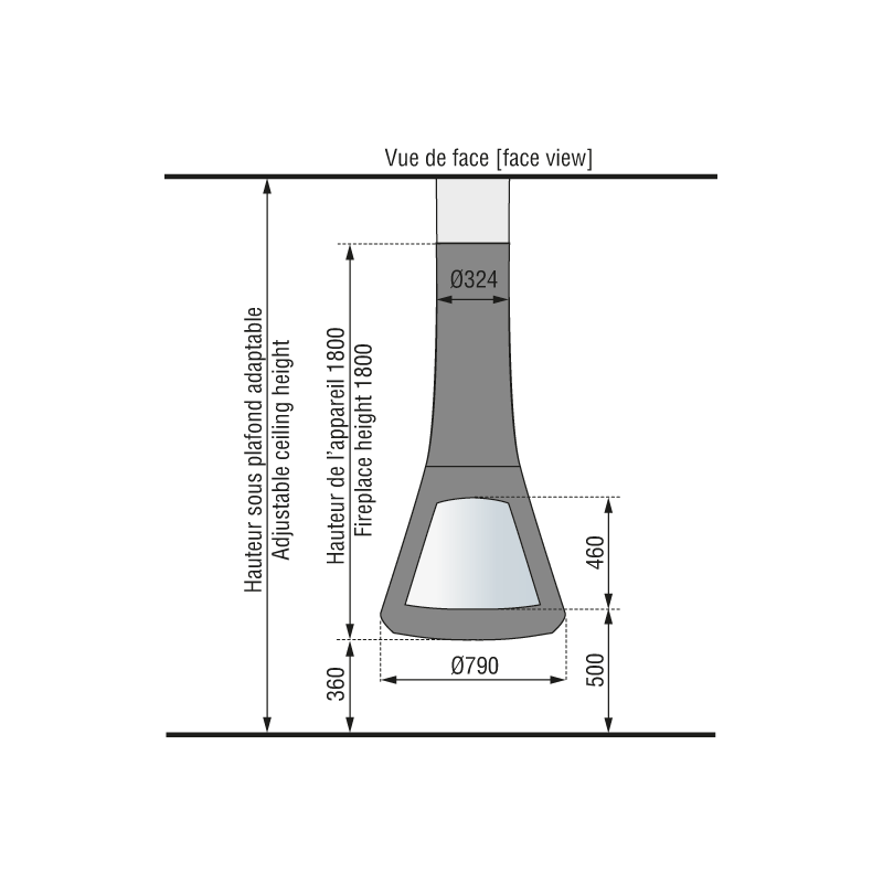 Plieninis židinys, Galia - 9 kW, Antracito spalvos, Montuojamas patalpos viduryje, Įstiklintos durelės, Tvirtinamas prie lubų, Su vitro keraminiu stiklu, Matmenys(PxAxG) 790x2500x790 mm, 5 metų garantija korpusui