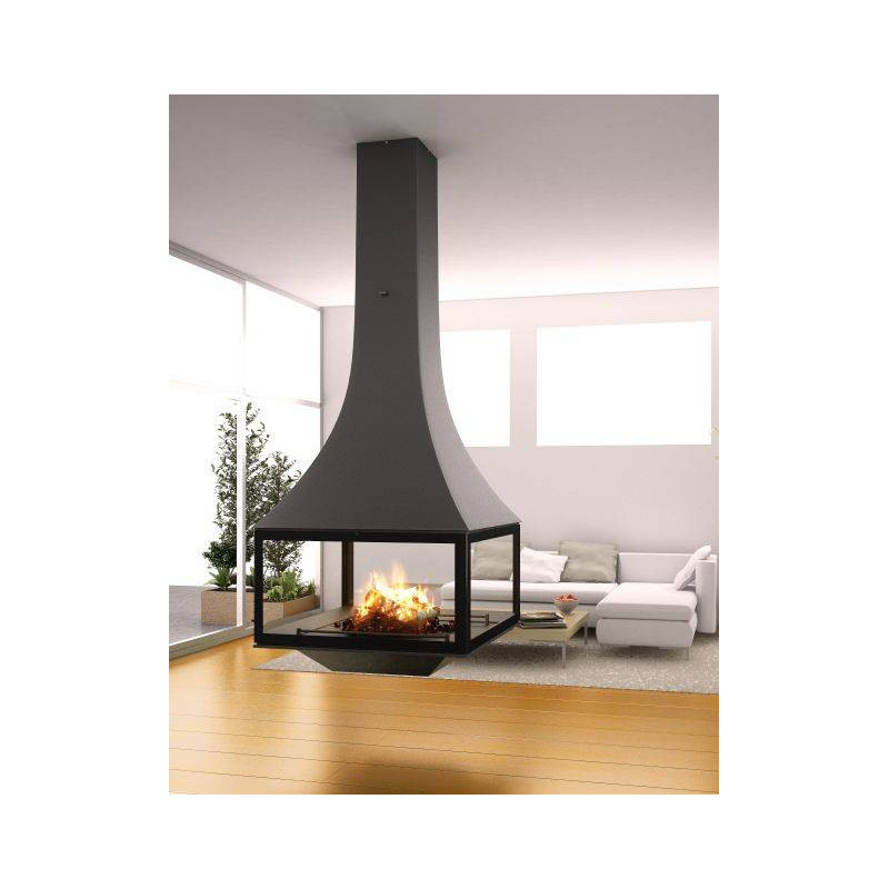 Plieninis židinys, Galia - 15 kW, Juodos spalvos, Be pagrindo, Montuojamas patalpos viduryje, Su vitro keraminiu stiklu, Tvirtinamas prie lubų, Matmenys(PxAxG) 810x2500x810 mm, 5 metų garantija korpusui