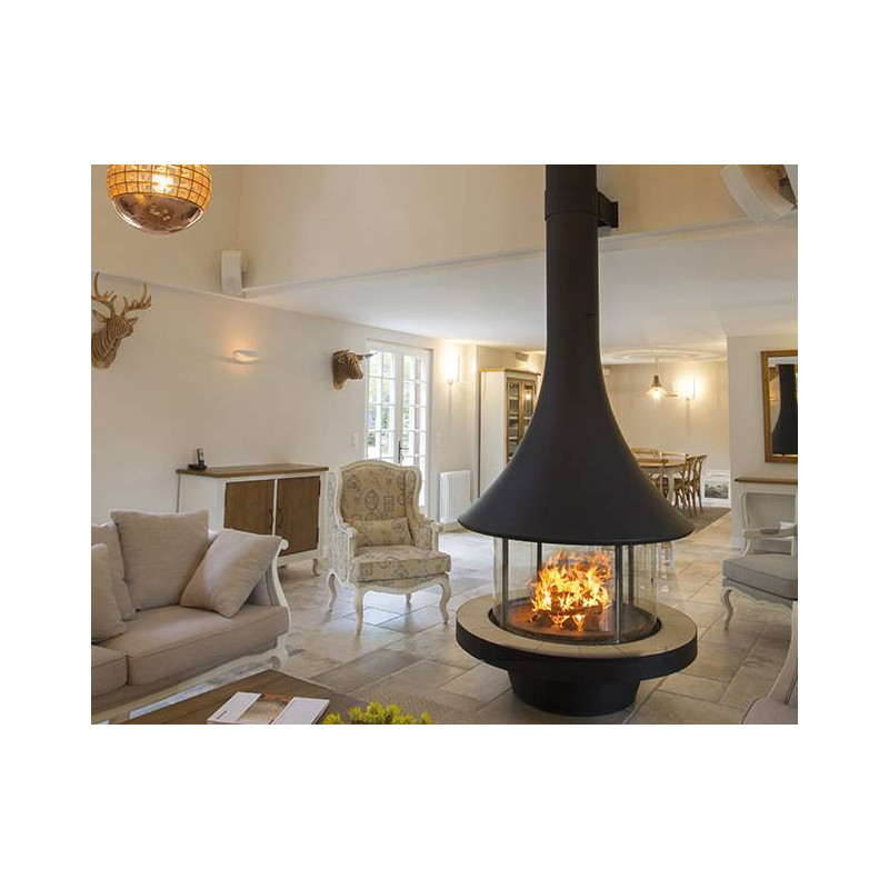 Plieninis židinys, Galia - 11 kW, Juodos spalvos, Montuojamas patalpos viduryje, Su pagrindu apačioje, Su keraminiu stiklu, Tvirtinamas prie lubų, Matmenys(PxAxG) 1170x2500x1170 mm, 5 metų garantija korpusui