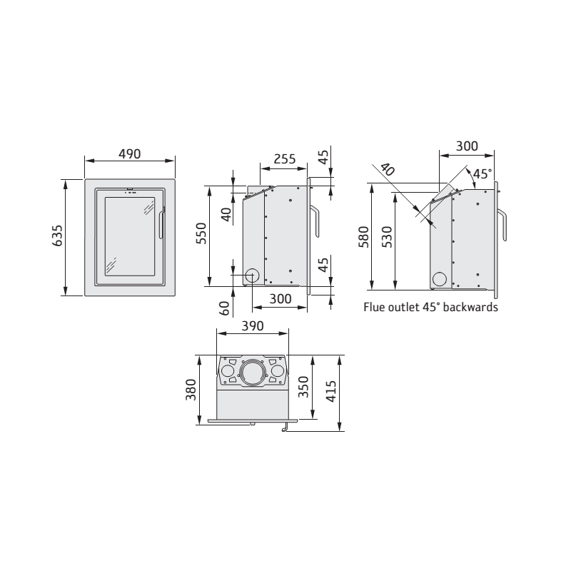 Plieninis židinio įdėklas, Galia - iki 5 kW, Tiesus stiklas, Juodos spalvos, Dūmtraukio pajungimas iš galo arba iš viršaus, Galimybė orą degimui paduoti iš lauko, Švaraus stiklo sistema, Matmenys(PxAxG) 490x635x350 mm