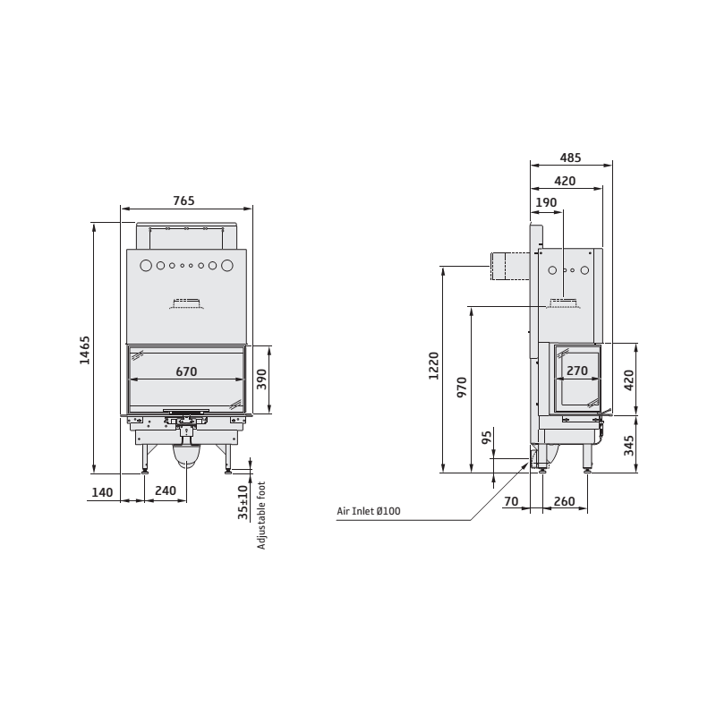 Plieninis židinio ugniakuras, Galia - iki 8 kW, 3 pusių stiklas, Juodos spalvos, Dūmtraukio pajungimas iš galo arba iš viršaus, Galimybė orą degimui paduoti iš lauko, Švaraus stiklo sistema, Matmenys(PxAxG) 765x1470x485 mm