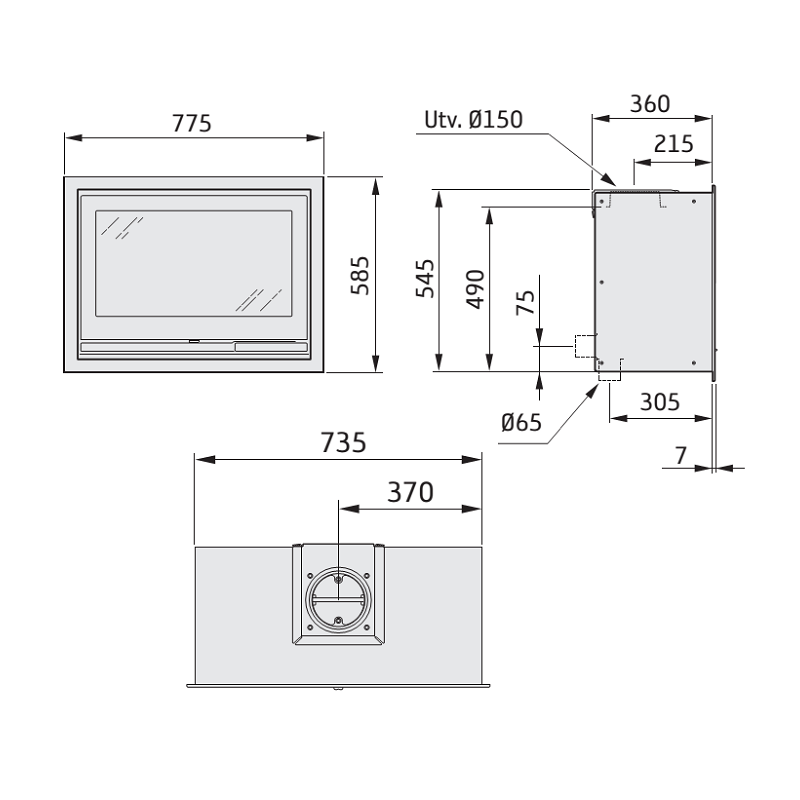 Plieninis židinio įdėklas, Galia - 7 kW, Tiesus stiklas, Juodos spalvos, Su stiklinėmis durelėmis, Dūmtraukio pajungimas iš viršaus, Galimybė orą degimui paduoti iš lauko, Švaraus stiklo sistema, Matmenys(PxAxG) 775x545x360 mm
