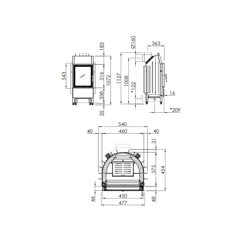 | Židinio plotis (ilgis), mm | 540 |