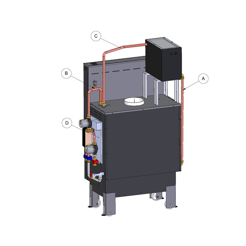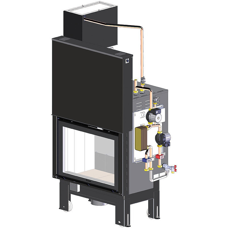 Židinio kapsulė su vandens kontūru, Antrinis degimas, Automatinis oro padavimo reguliavimas, Šildymo sistemos pajungimas, Šilumokaičio galia 14.0kW, Konvekcija 12.0kW, Cirkuliacinis mazgas komplekte, 1785x1082x607mm