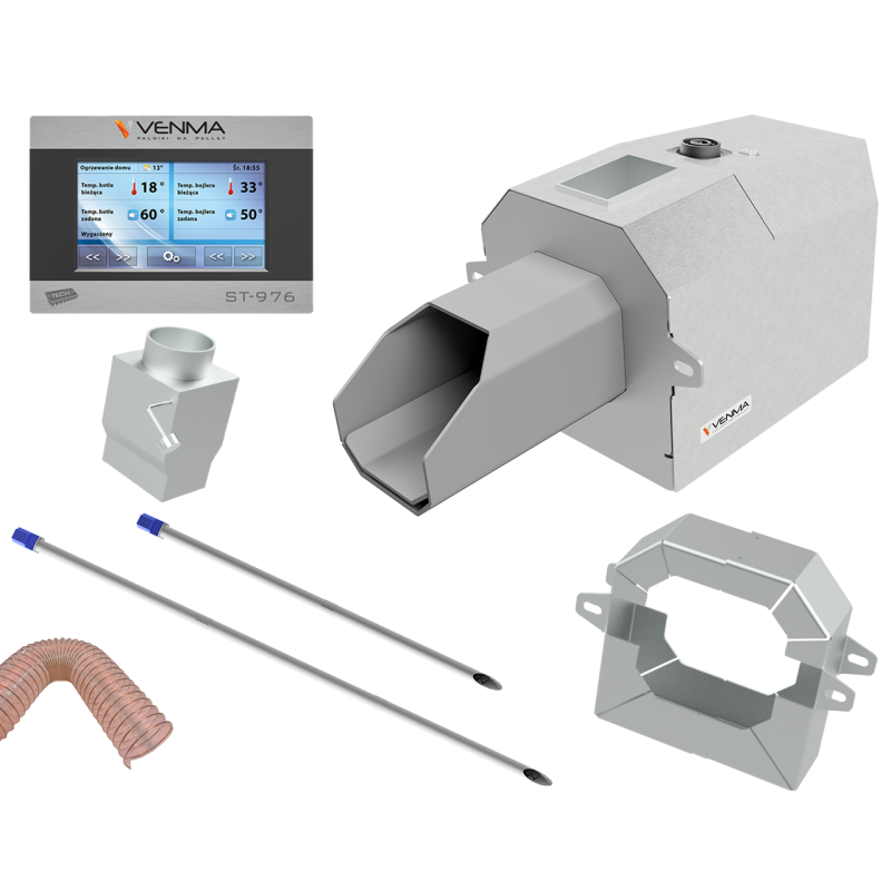 Granulių degiklis su padavimo šneku Kamen Venma Comfort, 250 kW. Pagal naujausias technologijas pagamintas nerūdijančio plieno granulių degiklis gali dirbti labai aukštomis temperatūromis (iki 1150 °C laipsnių). Degiklis Kamen Venma Comfort labai efektyviai sudegina kurą, yra ekologiškas, neteršia aplinkos ir pasiekia iki 99 % naudingumą. Degiklyje yra sumontuotas papildomas mechaninis išsivalymas.